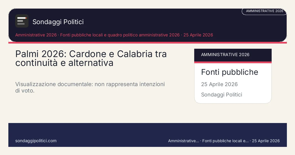 Questo contenuto usa fonti pubbliche locali, regole elettorali e quadro delle candidature per costruire una lettura di scenario su Palmi. Non è un sondaggio reale: non ci sono interviste, nessun campione contattato e nessun istituto demoscopico. Per leggere bene questi articoli conviene tenere insieme come leggere una simulazione AI, metodologia e limiti e la pagina Fonti e dataset.