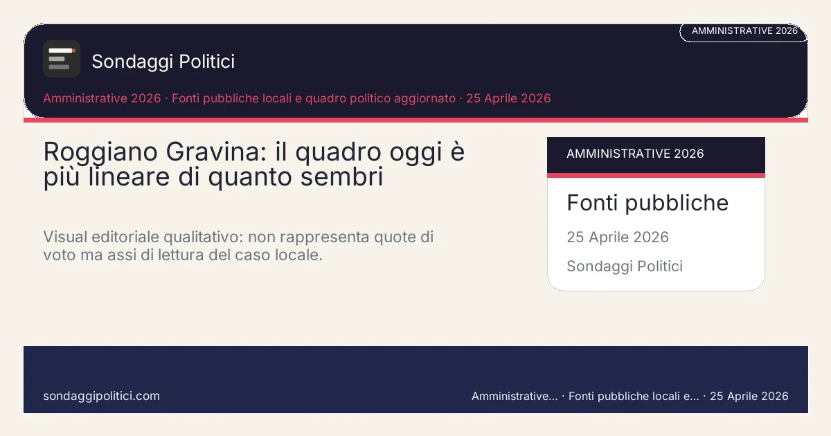 Questo contenuto non riporta un sondaggio con interviste su campione reale. È un aggiornamento editoriale costruito su fonti pubbliche locali e sulla rilettura prudente della simulazione AI già online su Roggiano Gravina.