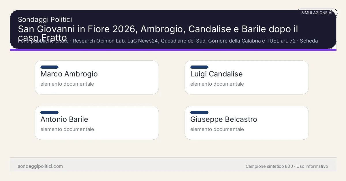 - Profili sintetici ripesati verso un elettorato locale calabrese/silano; nessuna persona reale intervistata.