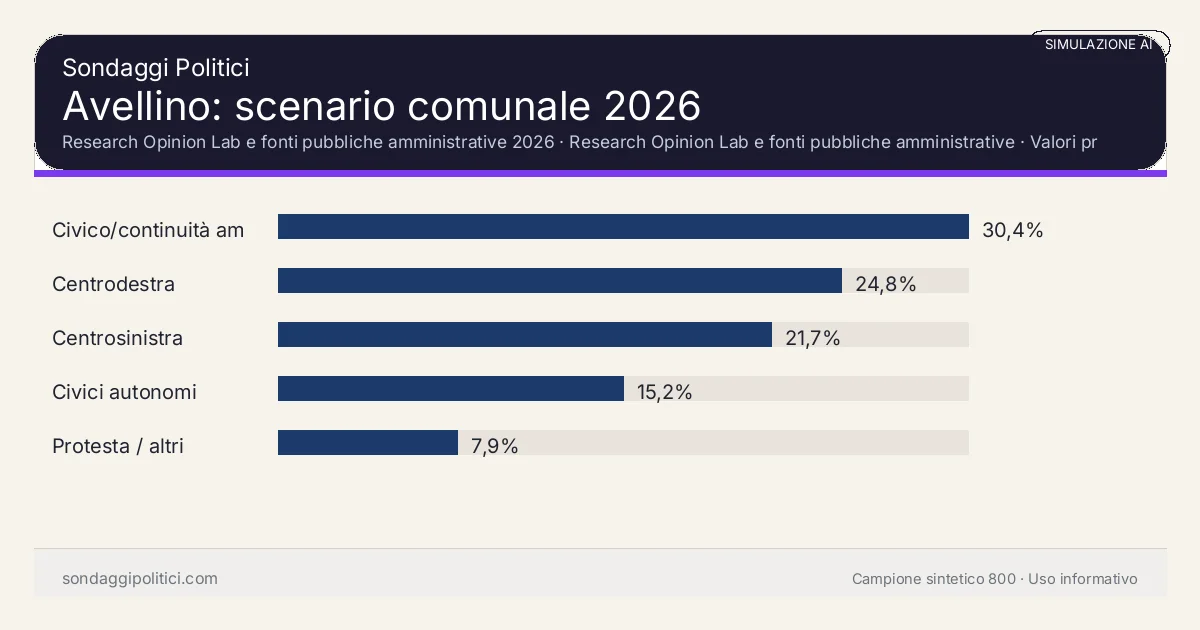 Avellino 2026: scheda di simulazione AI sulle amministrative nel territorio di Avellino, con dati tecnici, temi locali e riferimenti a Civico, Centrodestra, Centrosinistra e Civici autonomi; non è un sondaggio reale.
