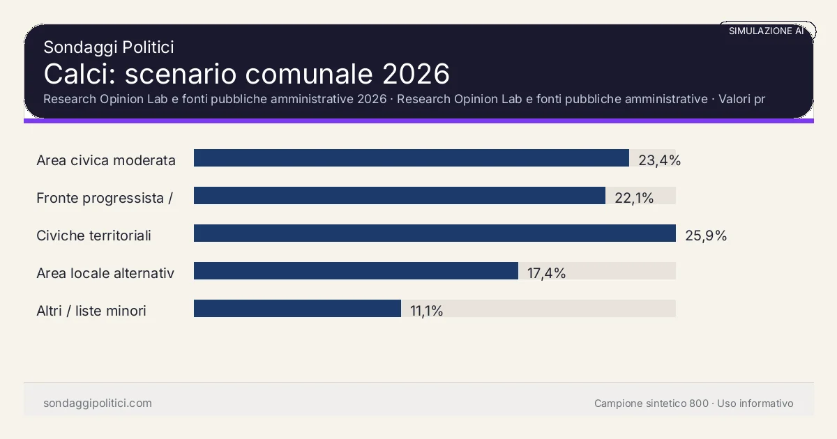 Calci 2026: questa pagina rilegge la simulazione AI alla luce dell’archivio amministrativo del Research Opinion Lab. La scheda resta un contenuto editoriale dichiarato: non è un sondaggio reale, non usa interviste a elettori e non certifica candidature non ancora confermate da fonti ufficiali.