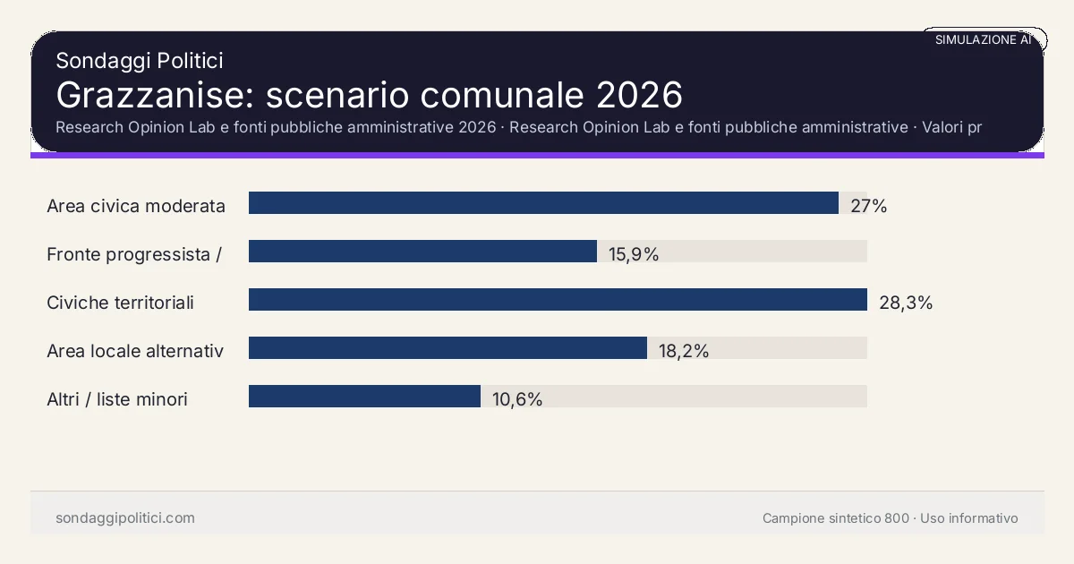 Grazzanise 2026: scheda di simulazione AI sulle amministrative nel territorio di Caserta, con dati tecnici, temi locali e riferimenti a Area civica moderata, Fronte progressista / civico, Civiche territoriali e Area locale alternativa; non è un sondaggio reale.