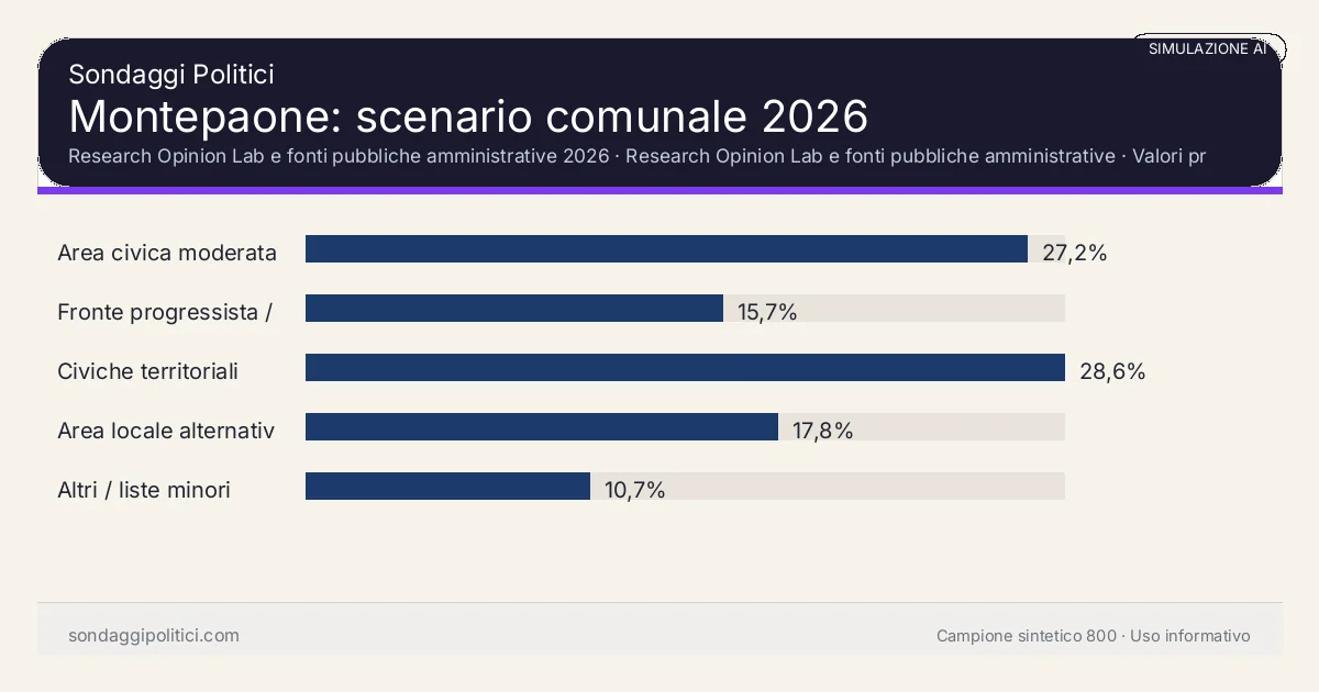 Montepaone 2026: scheda di simulazione AI sulle amministrative nel territorio di Catanzaro, con dati tecnici, temi locali e riferimenti a Area civica moderata, Fronte progressista / civico, Civiche territoriali e Area locale alternativa; non è un sondaggio reale.