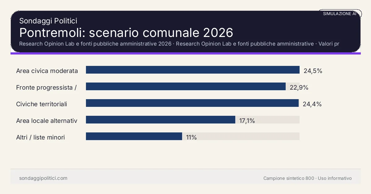 Nella scheda del lab l’area più visibile e Area civica moderata (24,5%). Questo dato serve solo a ordinare una lettura di scenario: non misura intenzioni di voto raccolte sul campo e va aggiornato se cambiano liste, candidature, ricorsi o apparentamenti.
