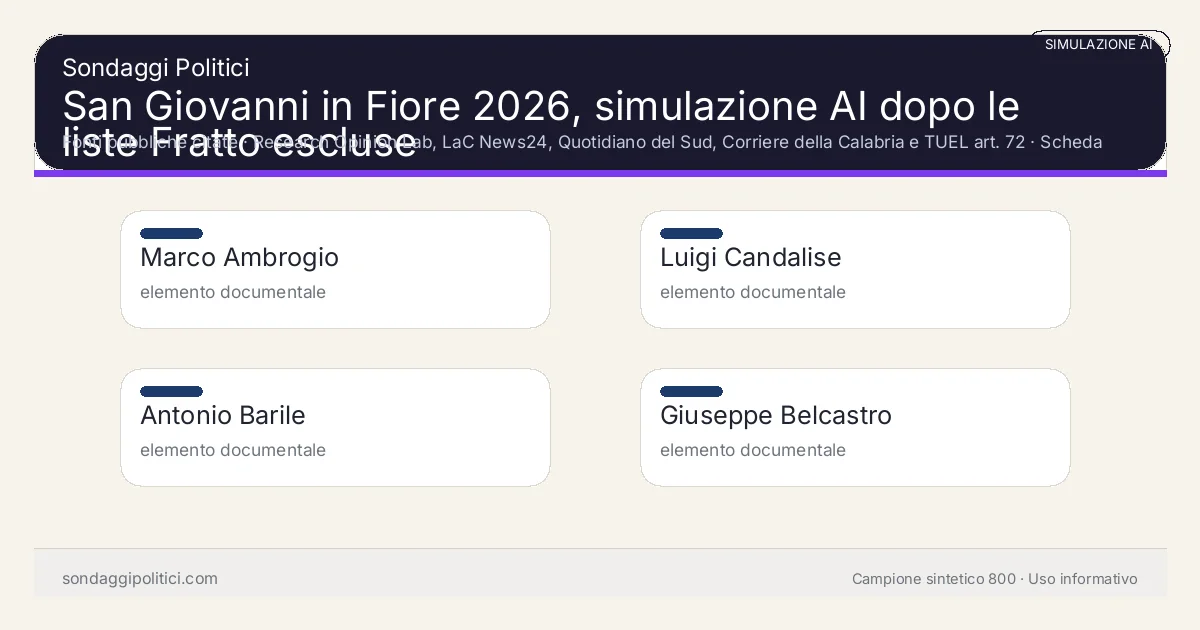 La base resta il modello locale Research Opinion Lab su 800 profili sintetici, ripesati verso un elettorato calabrese/silano e già usati per leggere San Giovanni in Fiore. L’aggiornamento del 28 aprile 2026 non è un sondaggio nuovo: ricalibra lo scenario dopo un fatto pubblico rilevante, cioè la ricusazione delle quattro liste collegate a Paola Stefania Fratto, con possibilità di ricorso al TAR.