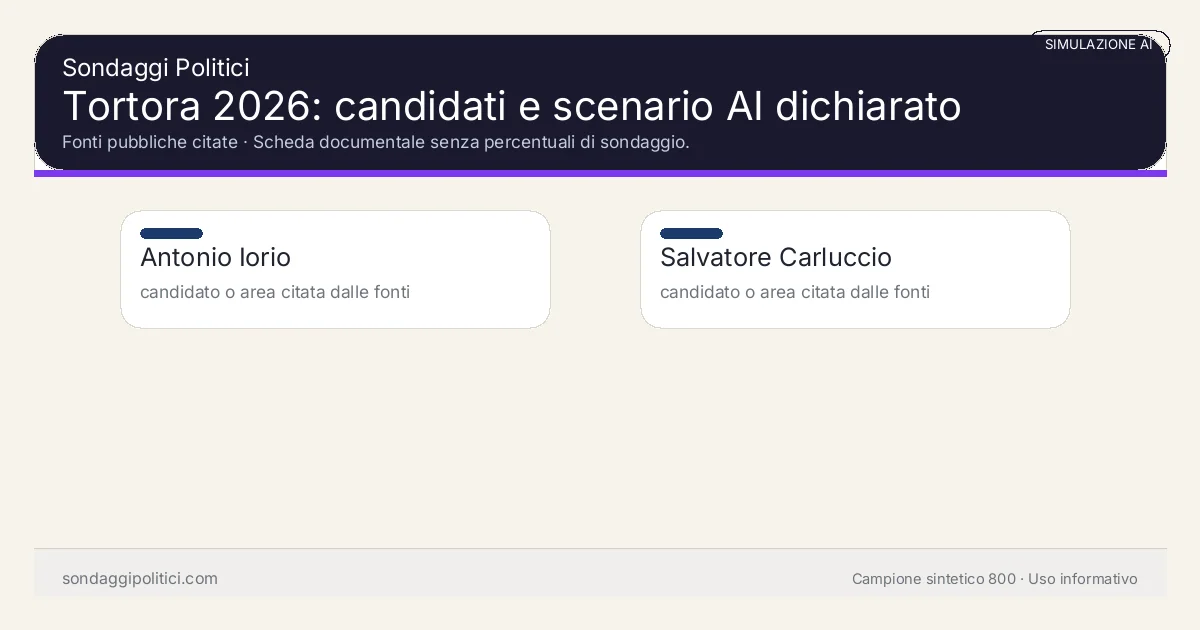 Tortora 2026: scheda di simulazione AI sulle amministrative nel territorio di Cosenza, con dati tecnici, temi locali e riferimenti a Antonio Iorio e Salvatore Carluccio; non è un sondaggio reale.