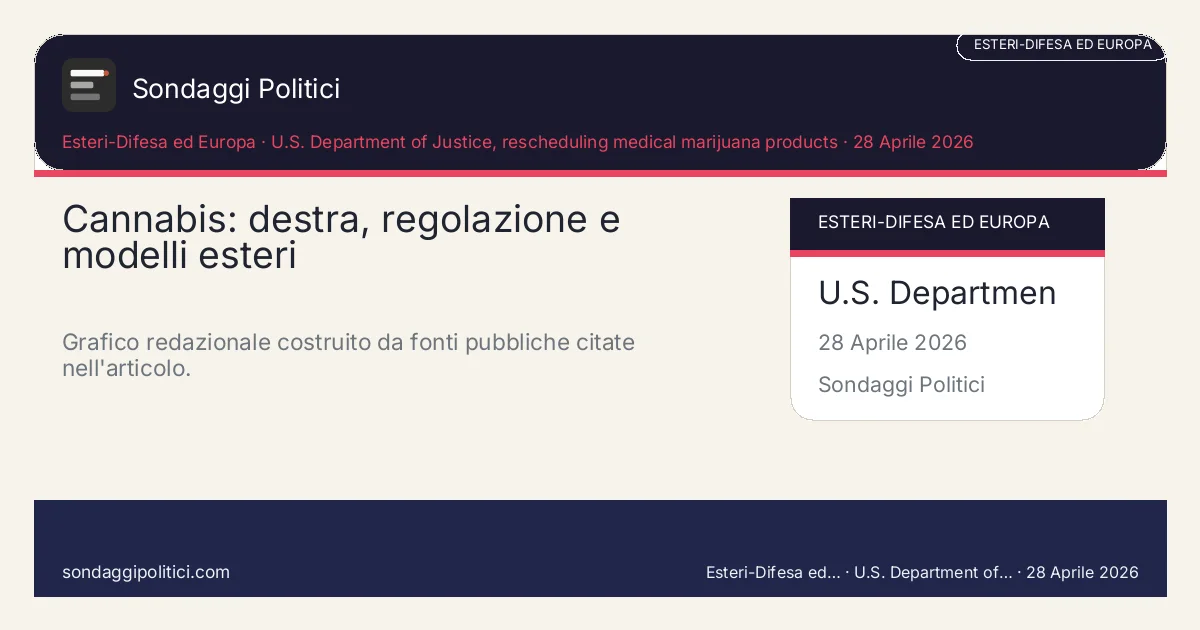Il Dipartimento della Giustizia statunitense, sotto l’amministrazione Trump, ha collocato i prodotti di marijuana medica approvati o regolati dagli Stati in Schedule III e ha aperto un percorso amministrativo per valutare una più ampia riclassificazione della marijuana. Non è legalizzazione federale ricreativa. Ma è il punto politico più rilevante: anche una amministrazione repubblicana può spostare il tema dal tabù alla ricerca, dalla punizione assoluta alla regolazione medica.