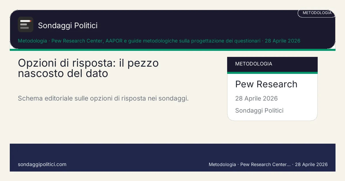 Fonte principale usata in questo articolo: Pew Research Center, AAPOR e guide metodologiche sulla progettazione dei questionari. URL sorgente: https://www.pewresearch.org/our-methods/u-s-surveys/writing-survey-questions/. Perimetro del contenuto: La pagina mostra perché la stessa domanda può produrre esiti diversi se cambiano scala, alternative offerte, ordine o descrizione delle risposte.